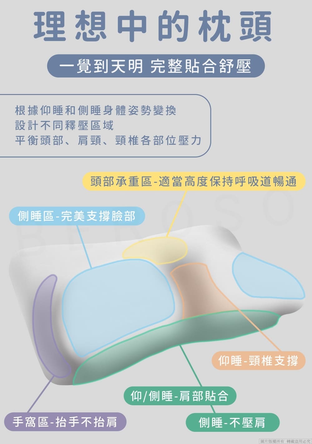 ■ 三種曲線設計,符合各種睡姿支撐頸肩部位